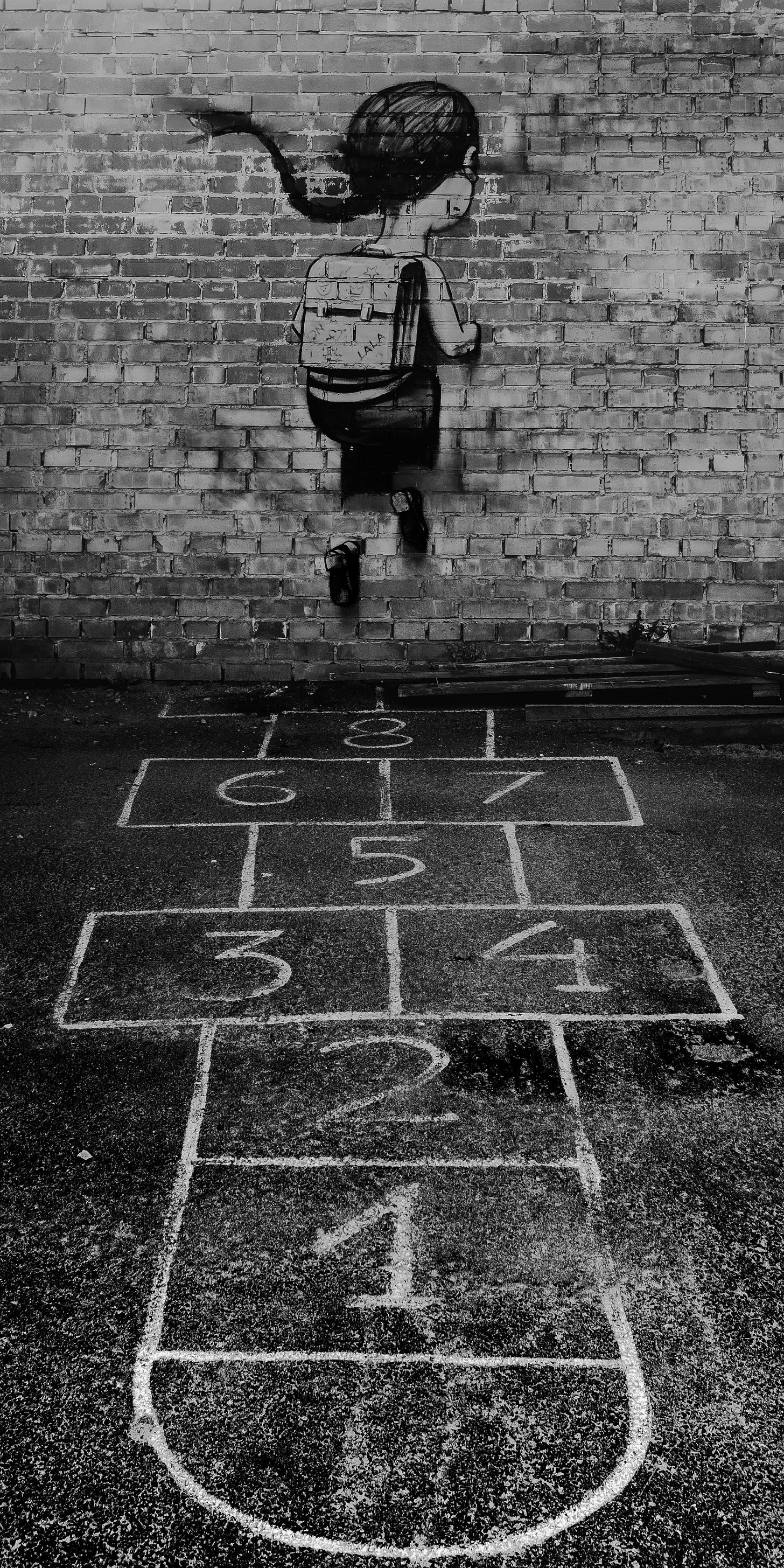 I looked out the window. Ella’s hopscotch board, a quilt of red, yellow, purple, green, and orange chalk lines forming squares with the numbers one to ten inside, occupied the pavement in front of our house. She drew it on Sunday and had been meticulously rechalking the lines wherever they faded from wind, sun, or footsteps.