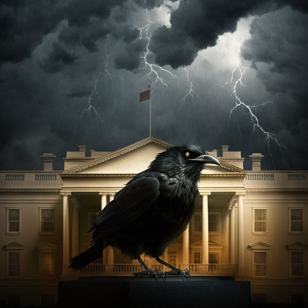 A crow swooped by the window, casting a deep shadow across the room as it passed under the brilliant security light outside the Oval Office, momentarily capturing the room’s attention.