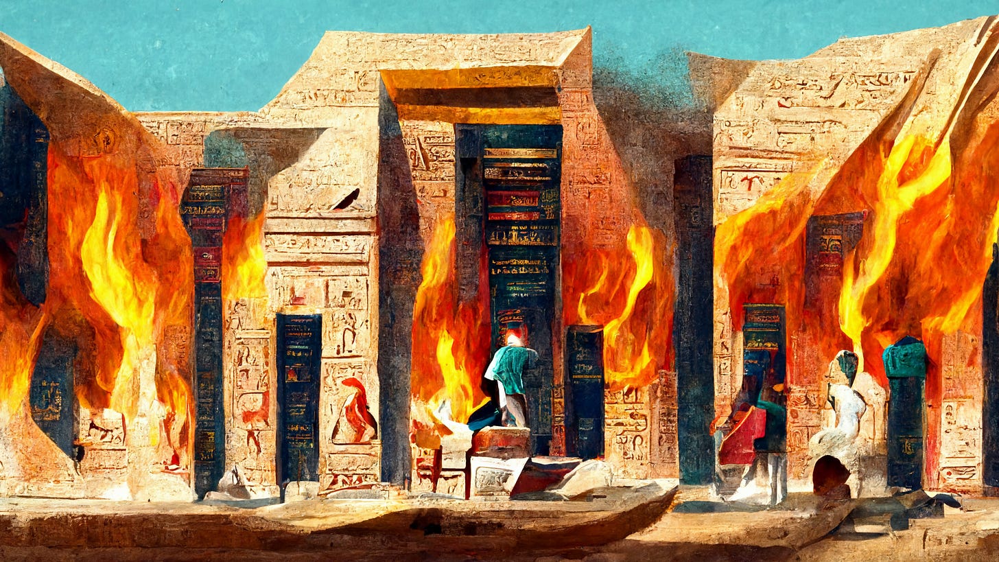 Pharaoh’s soldiers set the library on fire three days ago, transforming the grand building into a phlogiston inferno, their drunken breaths adding fuel to the blaze. All that remained of the building and its contents were fading embers.