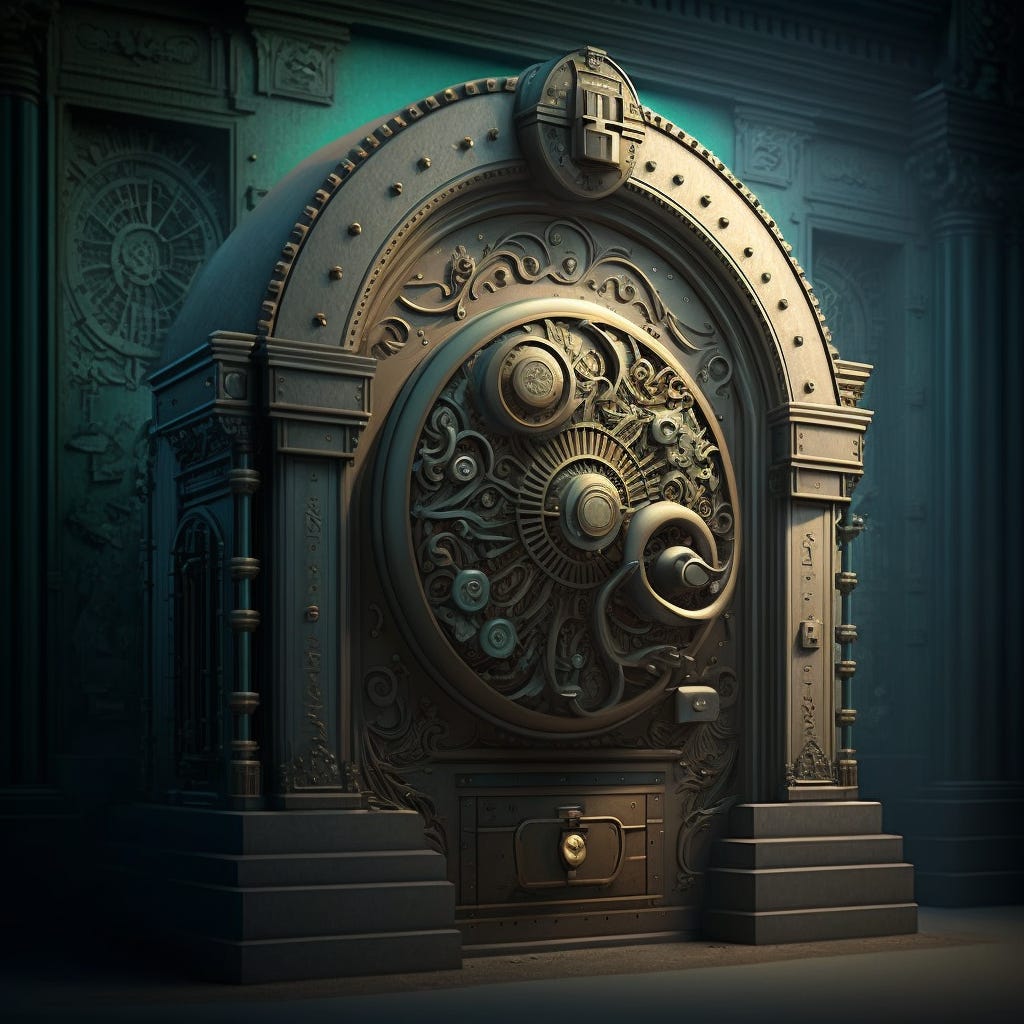 I’d never been on the other side of a bank safe door before. I knew many were circular, but I didn’t know why a designer chose this shape over the more traditional square door. Probably something to do with strength. The door looked impenetrable, exuding a fortress vibe with its twenty-six bolts, each as thick as a weightlifter's arm, Rube Goldbergesque gears, and clock.